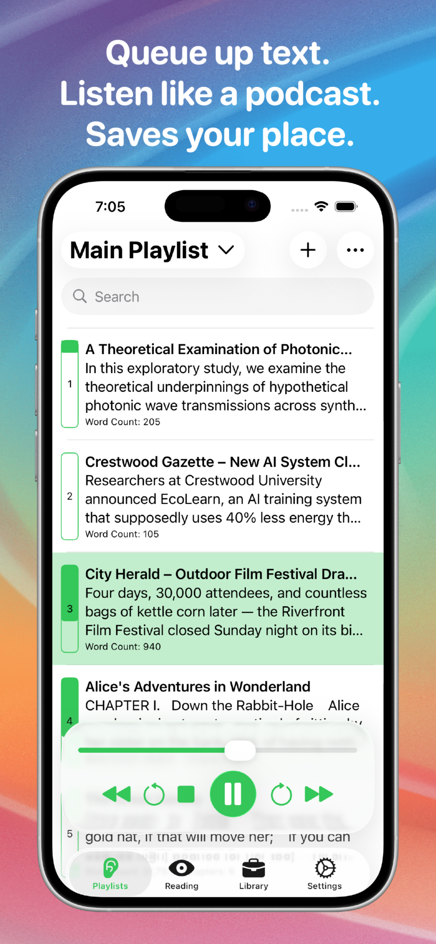 – Control playback like a podcast—pause, rewind, or skip ahead effortlessly.